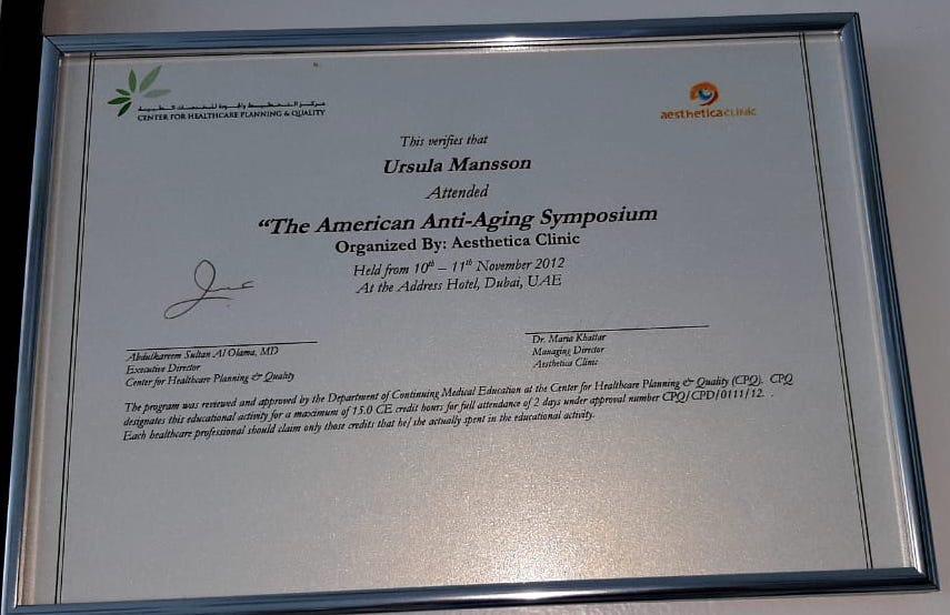 She took her Master of Lasers in Medicine in Aachen University and Master in Preventive and Anti-Aging Medicine in Dresden International University (DIU).